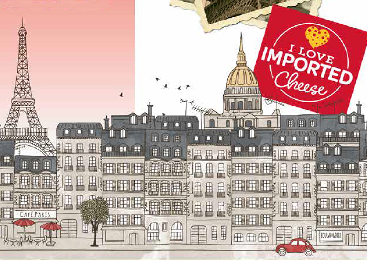 Parisian street scene with Eiffel Tower, buildings, and I Love Imported Cheese sign.