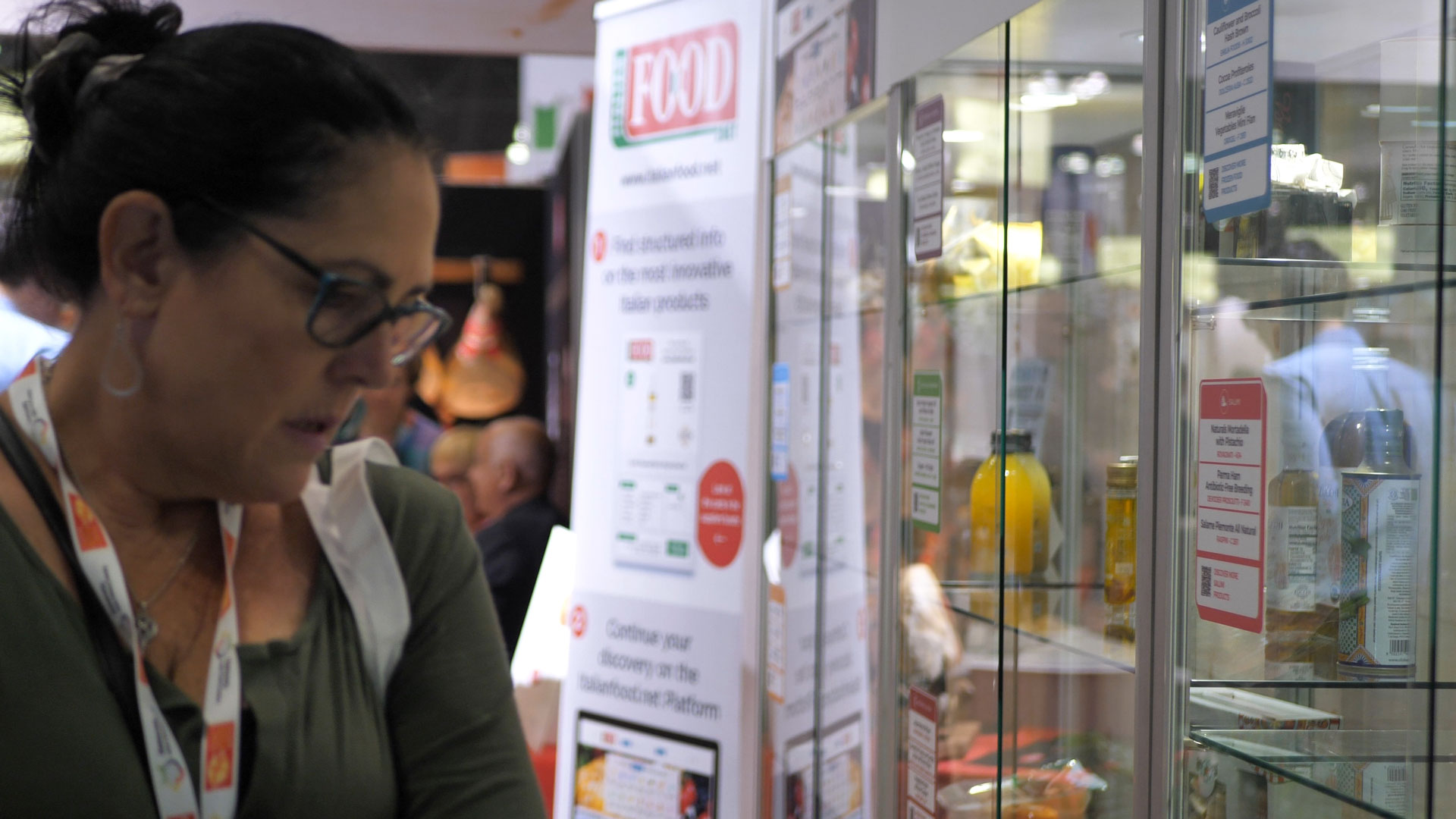 Woman views Italian food products at the Italian Food Awards USA 2019 event.