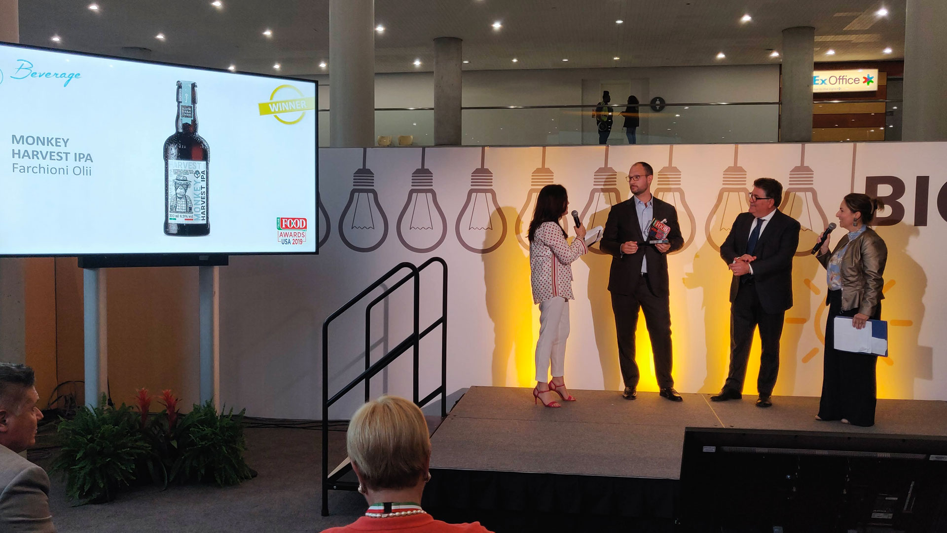 Italian Food Awards USA 2019: Winners on stage. Monkey Harvest IPA, Farchioni Olii, beverage award.