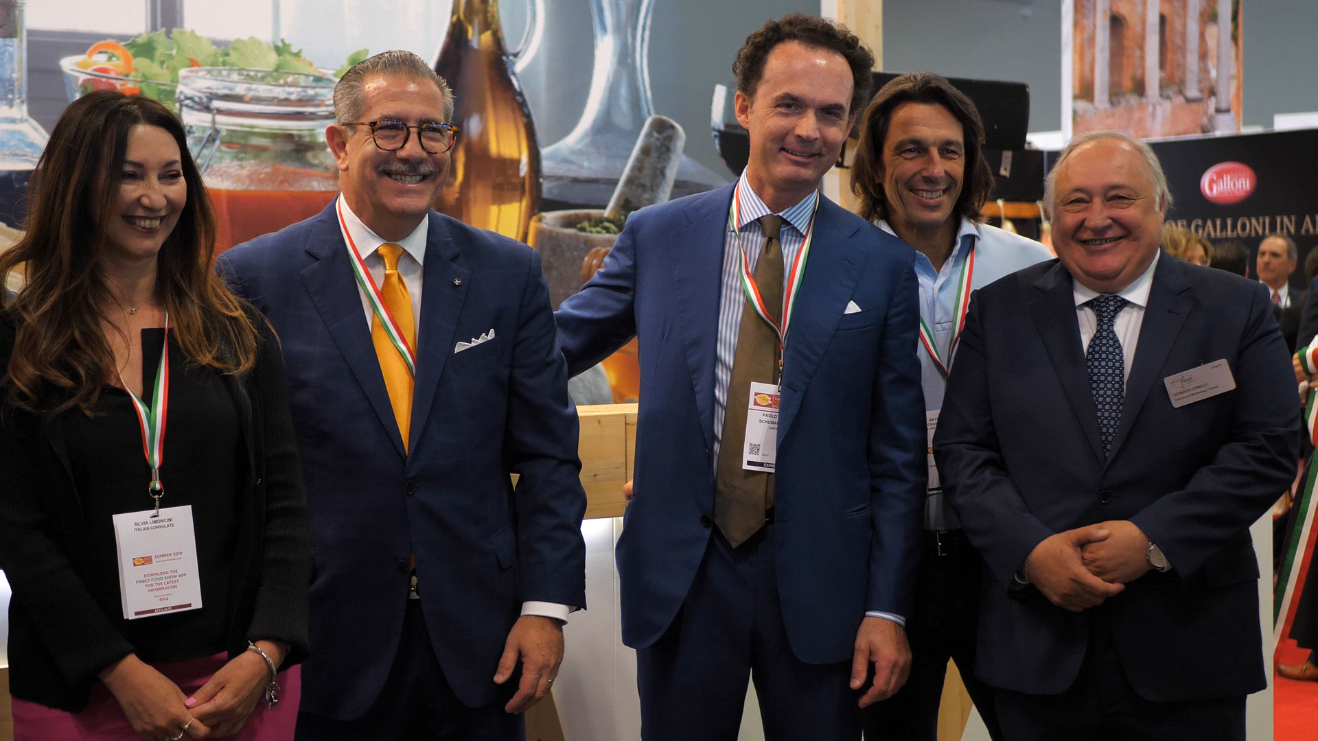 Italian Food Awards USA 2019 winners. Group of people at the awards ceremony wearing Italian flag ribbons.
