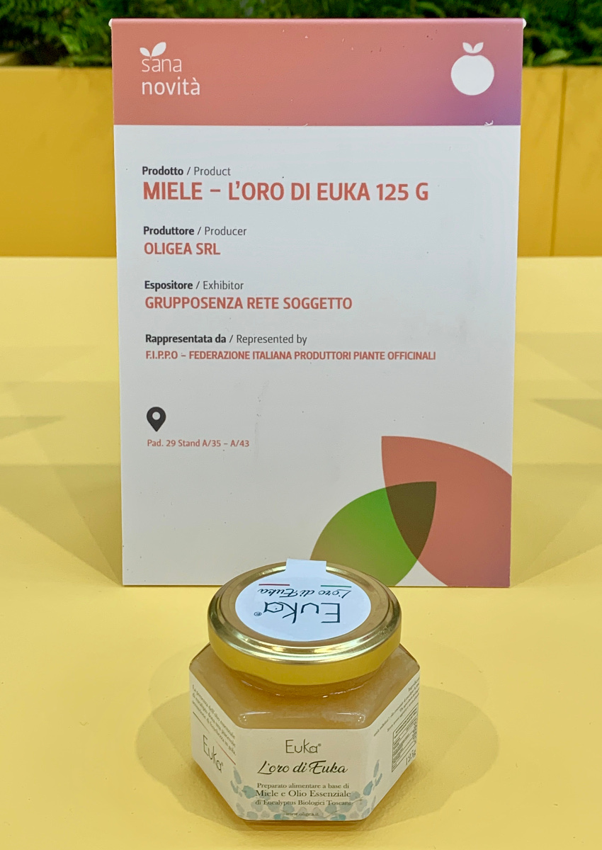Italian organic honey Euka L'oro di Euka from SANA 2019. Euka honey jar.