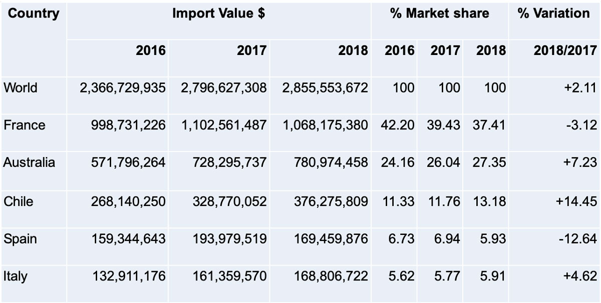 Wine import data: Italy’s Prosecco market share in China, 2016-2018. Table showing import value, market share, and variation by country.