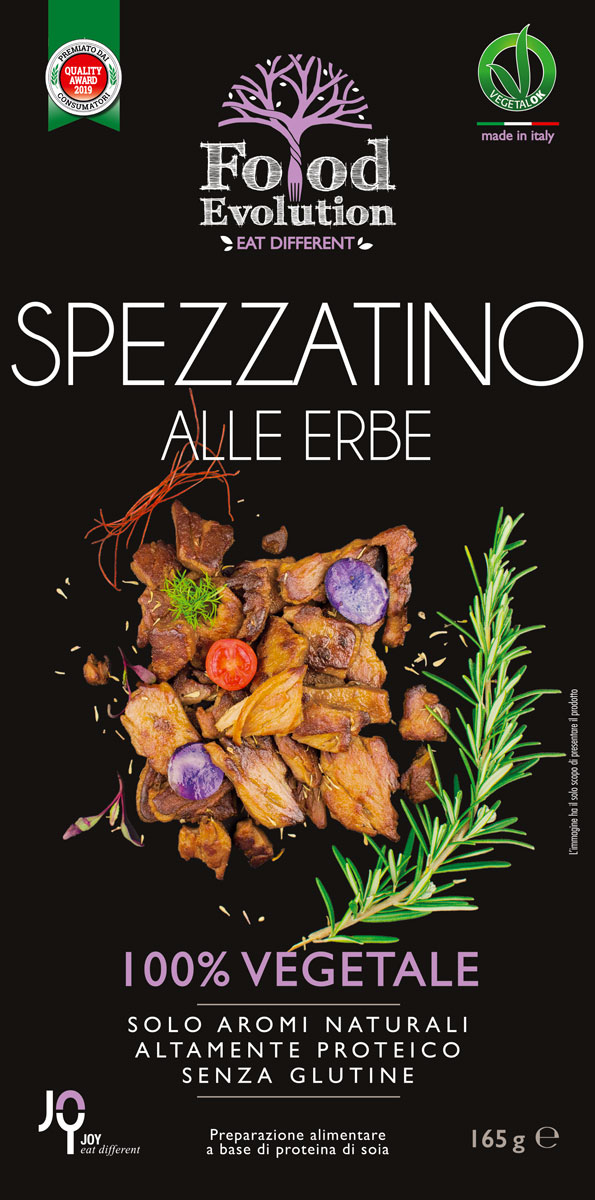 Plant-based Spezzatino alle Erbe. Vegan meat stew with herbs, potatoes, and tomatoes. Food Evolution's meat alternative.