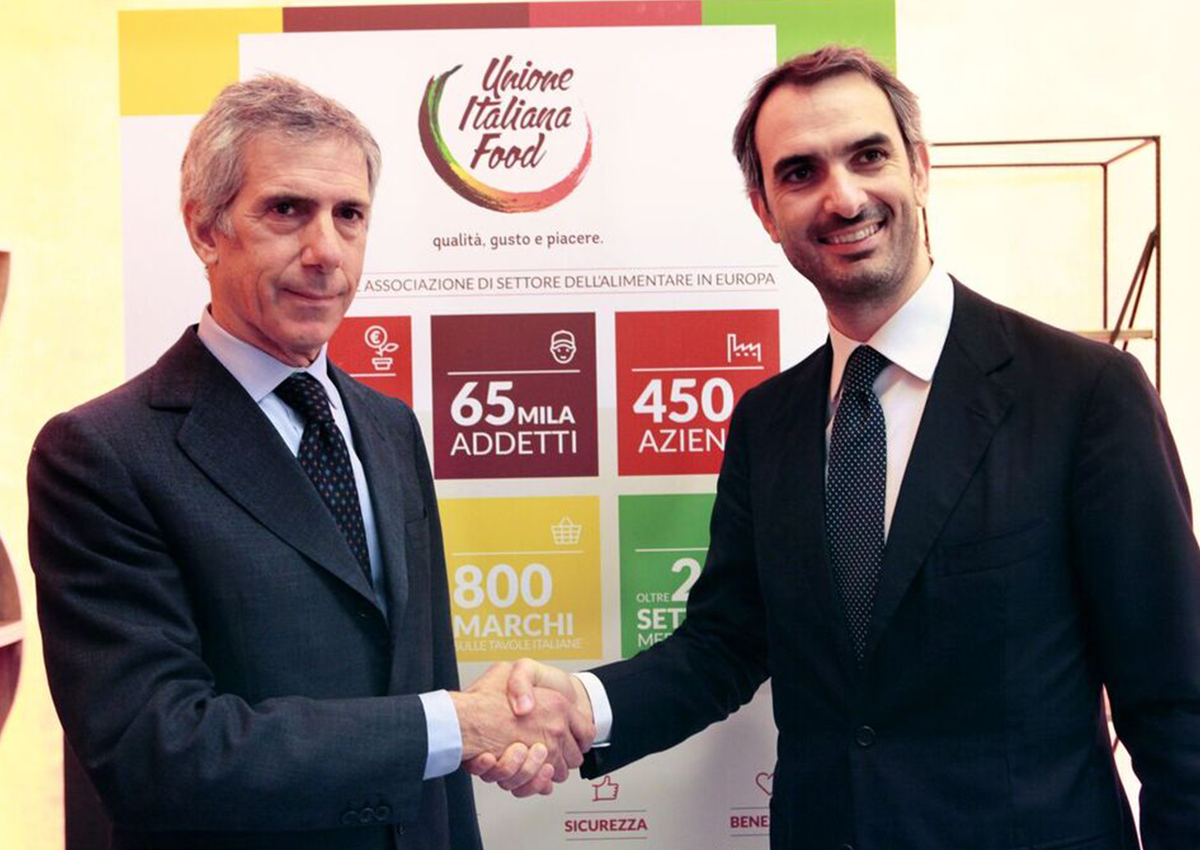 Italian Food Innovation: Two men shake hands in front of Unione Italiana Food banner.