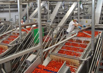 Italian tomato processing. Tomatoes on a conveyor belt in a food processing plant. © All rights reserved