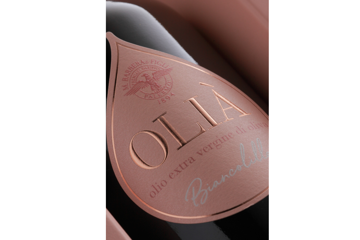 OLIÀ extra virgin olive oil bottle label. Biancolilla olive oil.